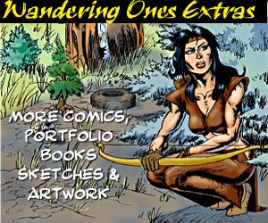 07-02-10 I have a new book out! The Wandering Ones books were formerly published by Keenspot, but I didn't have a very good grasp on sales numbers, what royalties were owed and so on. I decided to do the third book through CreateSpace, a division of Amazon and take control of my own creative stuff. It's the first entire book in comic BOOK format (as opposed to strip format) and I have to admit, it's one of my favorite stories. I got a lesson in how my stories meander, after realizing that it took me 200 pages to tell the tale. The book is available through Amazon ( or CreateSpace) I make a LOT more through CreateSpace, but if you just happen to have a cart at Amazon and feel like throwing book 3 in, I still do alright. In other news, I have 20 pages of the Wolfrun's Scout Trial story drawn, and 12 more to go. Then I have to color the whole thing. I think this one will appear in printed book form and downloadable PDF. I will put a 10 page preview up when I get it done. All you folks who've donated will receive a PDF copy. I will be taking an 8 page break at the end of this story, (sometime in August I think) and my APA 5 buddy Daniela Moreschachi will be drawing a short tale of Wolfie and Blue Shadow in a ghost town. There's a VERY good possibility that I will be teaming up on a supernatural thriller webcomic with none other than Maritza Campos! More on this as the project progresses. I hope you're are all doing well.