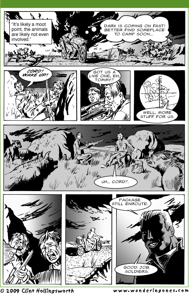 find someplace to camp soon... Cord! Wake up! Got us a live one, eh, Tommy?