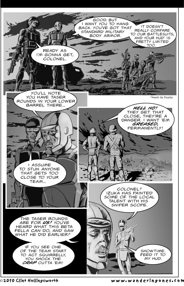 Ready as IÕm gonna get, Colonel. Good. But I want you to hang back. YouÕve got that standard military body armor. it doesnÕt really compare to our Battlesuits, and your HUD* is pretty limited too. YouÕll Note you have taser rounds in your lower barrel there... I assume to stun anyone that gets too close to your team... Hell no! They get that close, theyÕre a danger. I want 'em greased, permanently! The taser rounds are for us! youÕve heard what this beta fella can do, and saw what he did earlier? If you see one of the team start to act squirrelly, you shock the Crap outta 'em! Colonel? Izuka has painted some of the local talent with his sniper scope. Showtime. Feed it to my HUD..