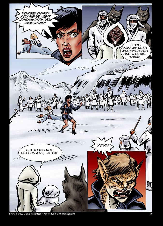 | I'm working on a story with Clan Of the Cats author Jamie Robertson featuring his character Melpomene (Mel Pahm Meh Nay -as best I can pronounce it) It's a Keenspot Premium strip, (subscription) so few people are getting to read it. I so rarely see my work in color, especially with a good colorist like Jamie, I wanted to show this page off. I'm really penciling loosely with these and then tighteing in the ink stage. (I also letter it) then Jamie colors it. I'm thrilled to see it each week. |
